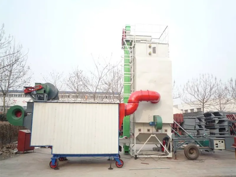移动式小型粮食烘干机主要由烘干段,缓苏段,冷却段等组成,采用混流烘干技术,以干净热空气做介质,可单次或循环烘干。粮食在重力作用下沿着角状盒之间的通道由上向下缓慢的流动,热风则由进风角状盒进入烘干机内部,然后穿过粮层流向周围的排气盒,然后变成废气而从排气盒排出机外。粮食在烘干机内受热升温,温度是个交变的过程。由于粮食层较薄,风机功率小,电耗小,也降低了成本。热风炉由炉体和热交换器等组成,以煤、秸秆、废木材、稻壳等作燃料。换热器由耐热材料制成,因而有热效率高,使用寿命长的优点。
