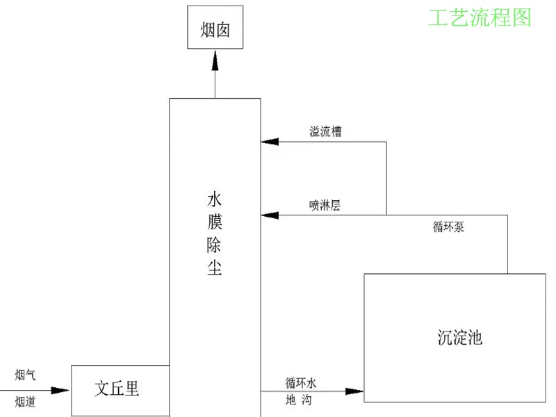 水膜脱硫除尘器由文丘里(收缩管,喉管及扩散管),塔体,沉淀池、水泵和循环水管路组成。水墨脱硫除尘器含尘气体首先进入文丘里,随着截面变窄,气流速度增加,高速气流与文丘里内喷淋溶液撞击,形成雾滴后捕集一部分粉尘;脱硫除尘器烟气继续前进经水膜切向入口进入筒体,在上升过程中与筒壁的水膜接触,烟气中的粉尘被水膜捕集。水膜脱硫除尘器循环水中加入碱液后同时具有脱硫功能。