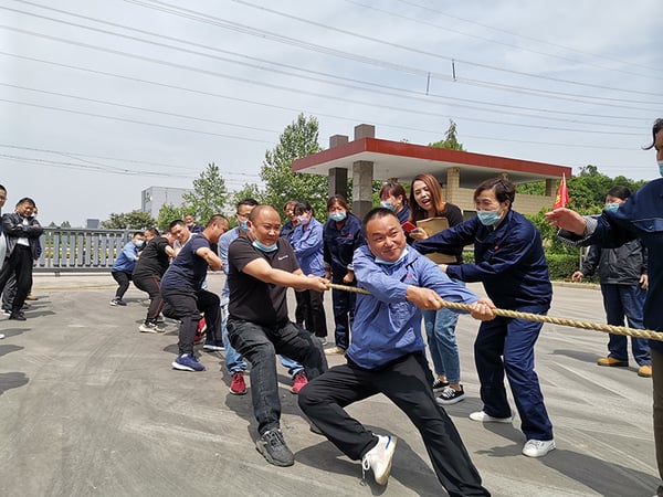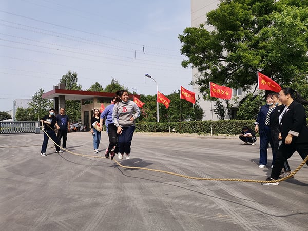 比赛结束后,员工们抡起大绳,身着工装的员工们,纷纷跃入绳中,随着上下翻飞的绳子,仿佛回到了快乐的童年时光。