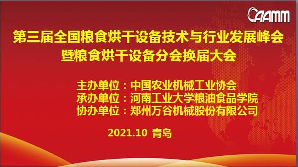 2021年10月27日,中国农业机械工业协会粮食烘干机分会换届大会及第三届全国粮食烘干设备技术与行业发展峰会在青岛“国际农机展”期间成功召开。本届峰会由中国农业机械工业协会主办,河南工业大学粮油食品学院承办,郑州万谷机械股份有限公司协办。
