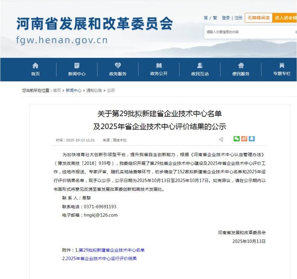 近日,河南省发展和改革委员会发布公告《关于第29批拟新建省企业技术中心名单