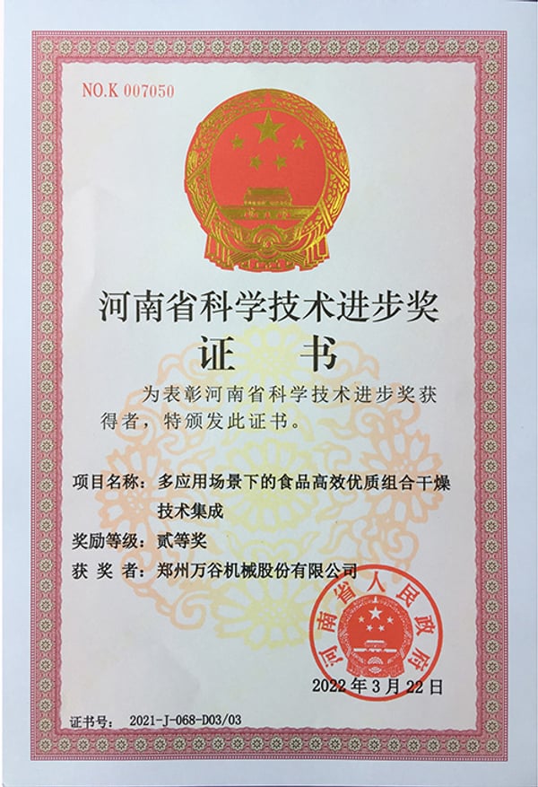由郑州万谷机械股份有限公司、河南科技大学和中国农业大学联合参与的“多应用场景下的食品高效优质组合干燥技术集成”项目在河南省2021年科学技术奖评选中荣获“科技进步二等奖”,这也是公司继2017年获得河南省科学技术三等奖和2021年获得农业部神农中华农业科技二等奖之后再次荣获省部级科技技术奖励。