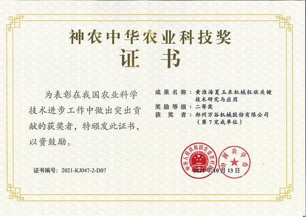 日前,农业农村部公布了2020-2021年度神农中华农业科技奖的表彰决定,郑州万谷机械股份有限公司荣获“2020—2021年度神农中华农业科技奖二等奖”。