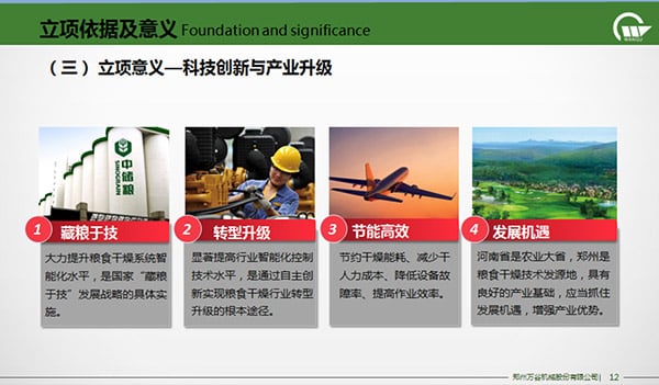 “智能粮食干燥系统关键技术与装备开发及应用示范”是郑州万谷机械股份有限公司依据我国粮食烘干机行业发展趋势以及提升我国粮食烘干机产业智能化水平的需要提出的技术创新研发课题。智能化粮食干燥技术与装备,能够将烘干机的运行状态实时监测,并运用大数据分析技术和专家诊断系统对远程采集的数据实时分析、比对并动态智能调整运行参数,减少人为干预,避免误操作,能够有效减少现场工作人员数量,提高烘干操控精准性,进而提高烘干品质。