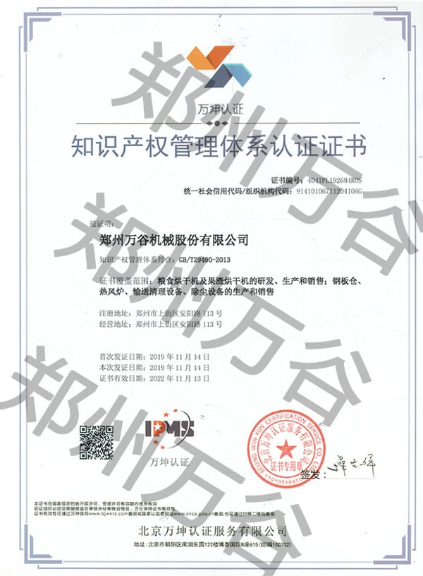 近日,郑州万谷机械股份有限公司获得第三方认证机构颁发的“知识产权管理体系认证”证书,标志着郑州万谷在知识产权管理及科技创新体系领域又迈上新的台阶。郑州万谷机械将以此为契机为我国粮食烘干机产业知识产权规范的提升发挥积极作用。